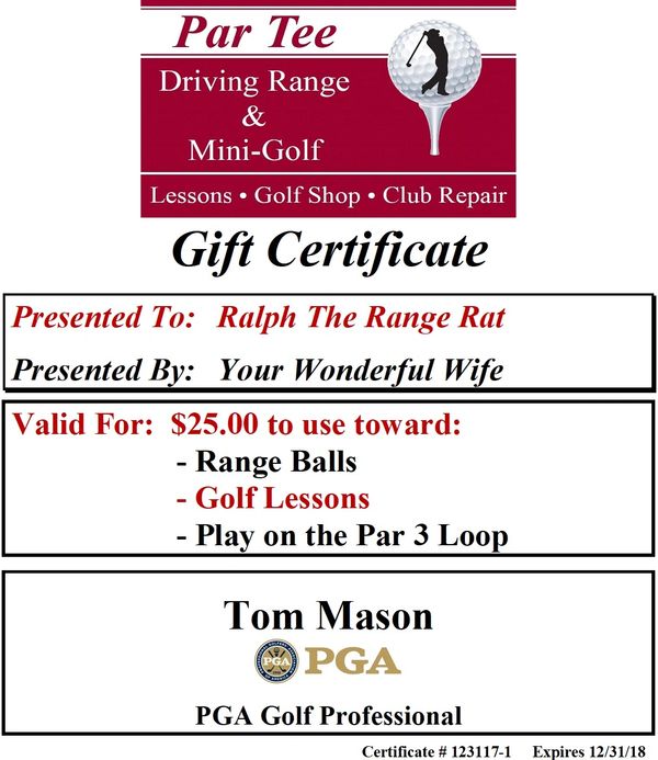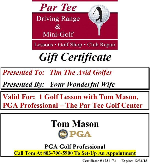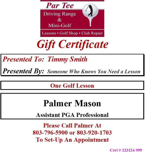 You can purchase Gift Certificates For The Par Tee Golf Center for any dollar amount. Gift Certificates can be applied to Range Balls, Golf Instruction, Par 3 Play, Club Repair, Miniature Golf or Merchandise in the Golf Shop. Once your order is placed, we will email you the certificate. Please note, it might take up to and hour or so to receive the certificate by email. Simply click on the amount you would like to purchase the gift certificate for below, or if the dollar amount is not listed below, you can call the Golf Shop directly at 803-796-5900 and we can process your Gift Certificate Order over the phone. Gift Certificates for Individual and Series of Lessons are at the very bottom of the list. All Gift Certificates expire One Year from The Issuing Date.